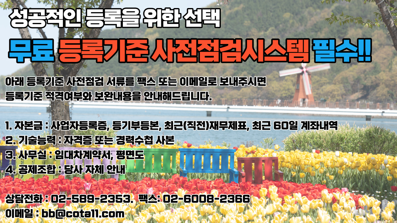 일정 자본금 기준을 충족하고 공제조합에 예치금을 등록하고 기술자와 사무실을 갖추면 완료 됩니다.
